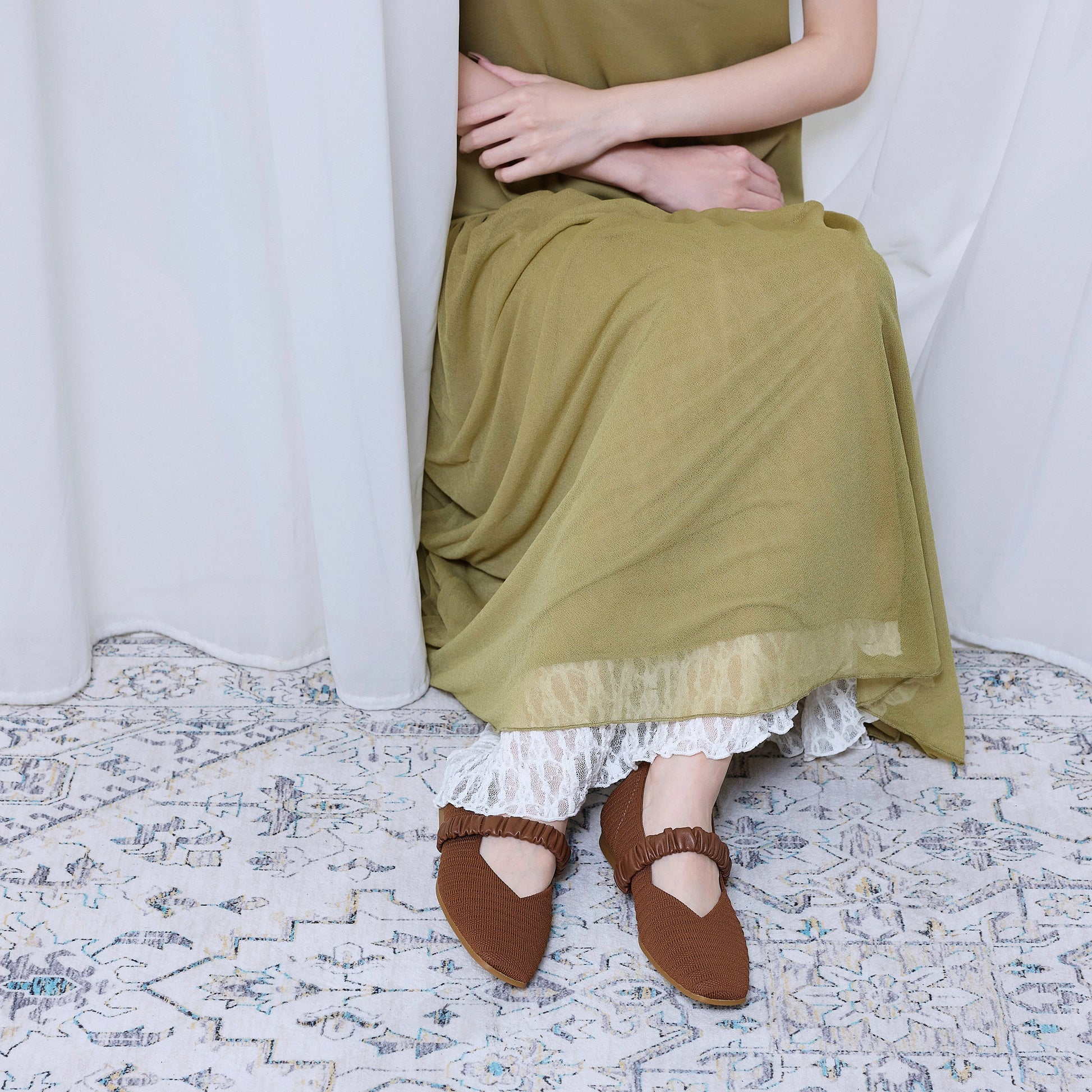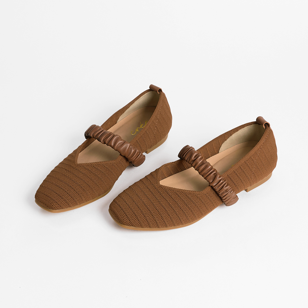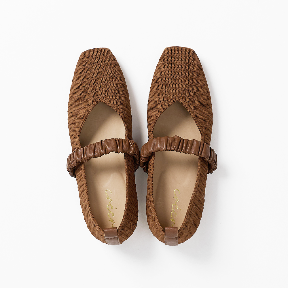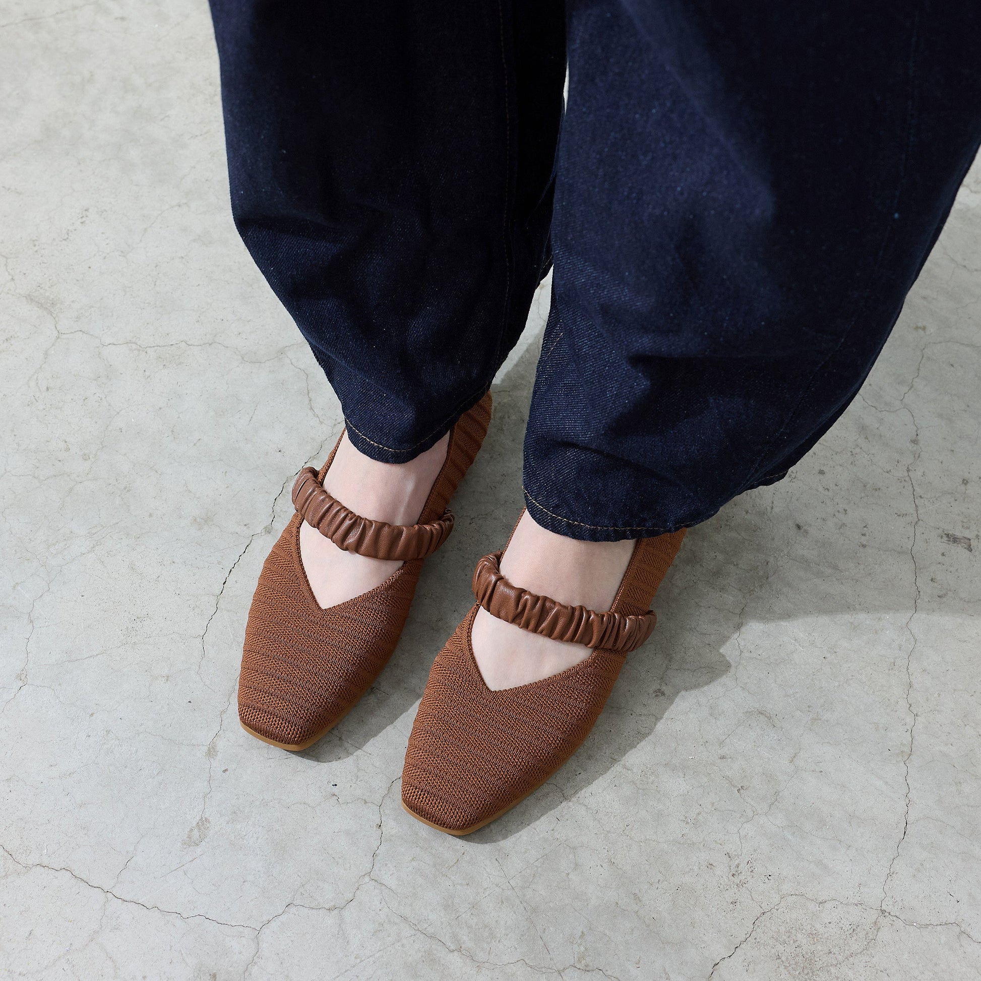 The sweater-like knit surface contrasts with a ruched leather Mary-Jane band — a subtle play of textures united in one tone. Dusky and understated, with leather detailing that quietly elevates the look.