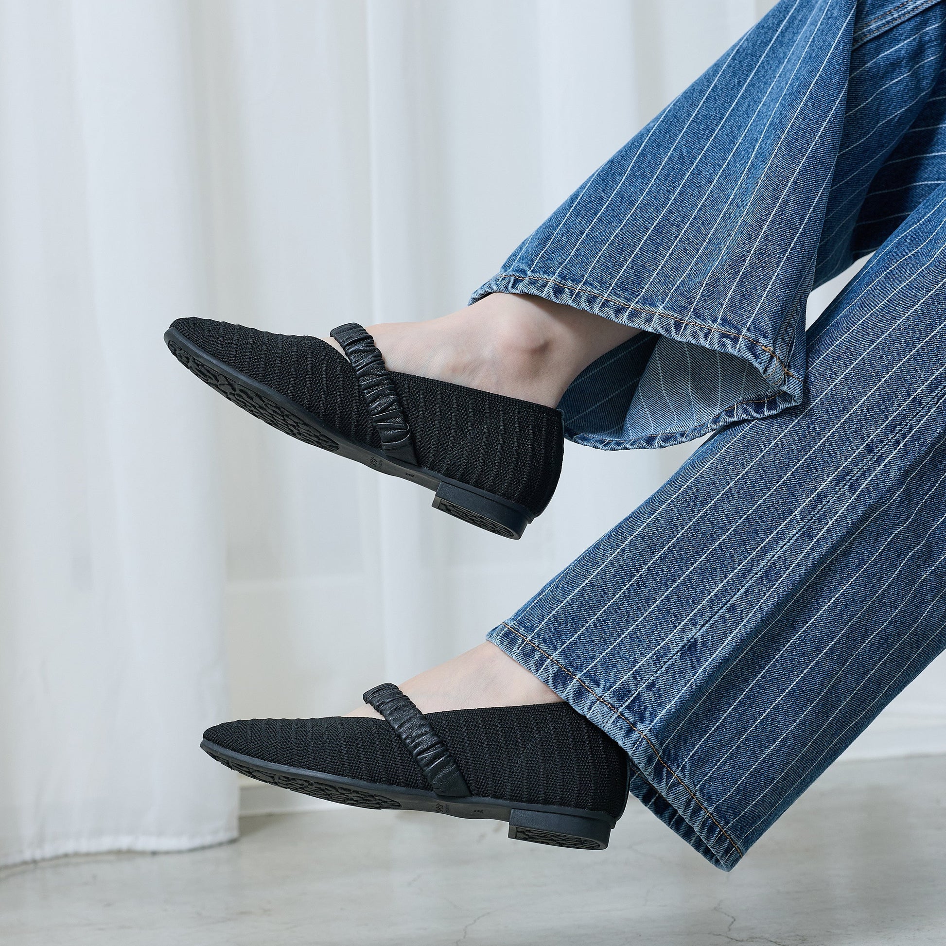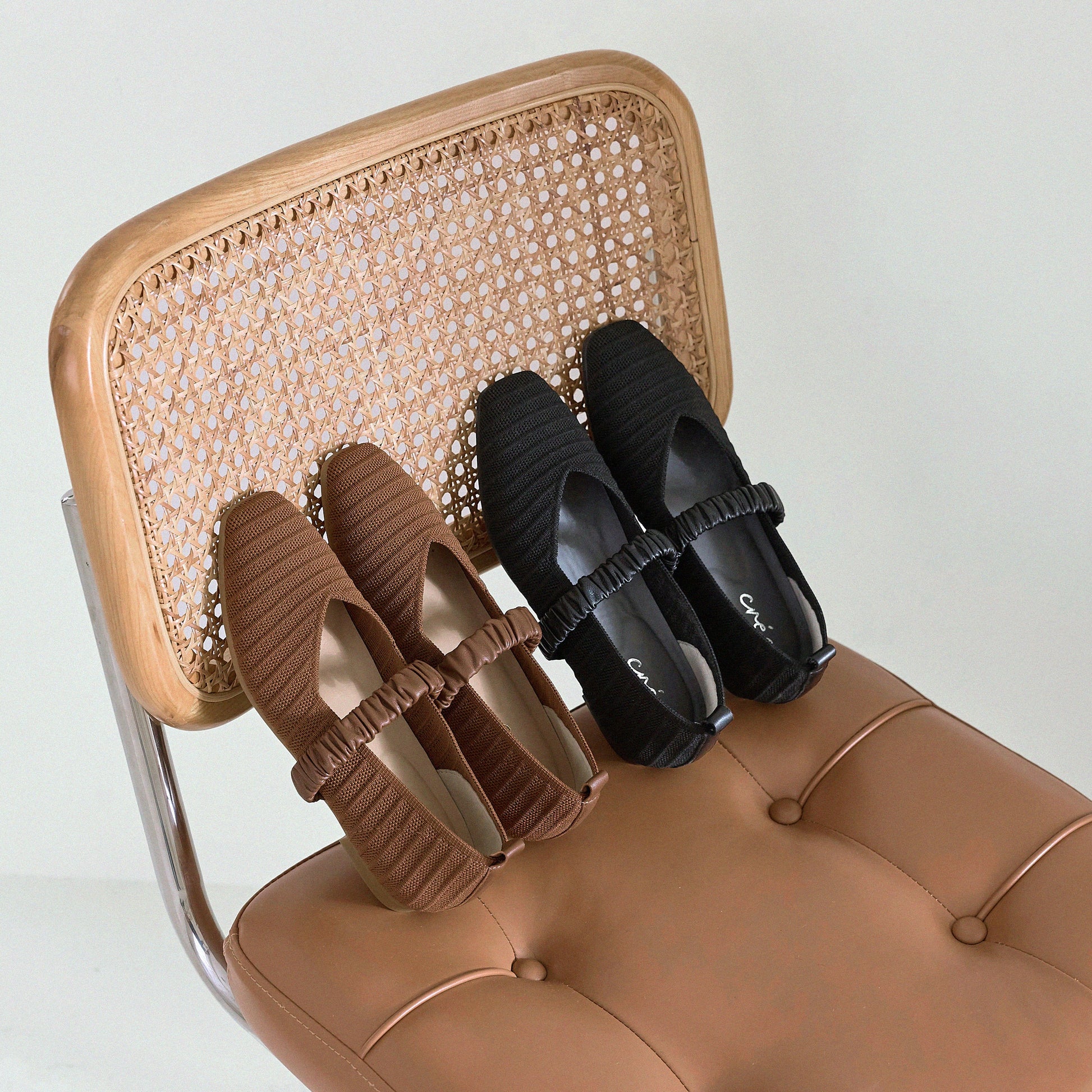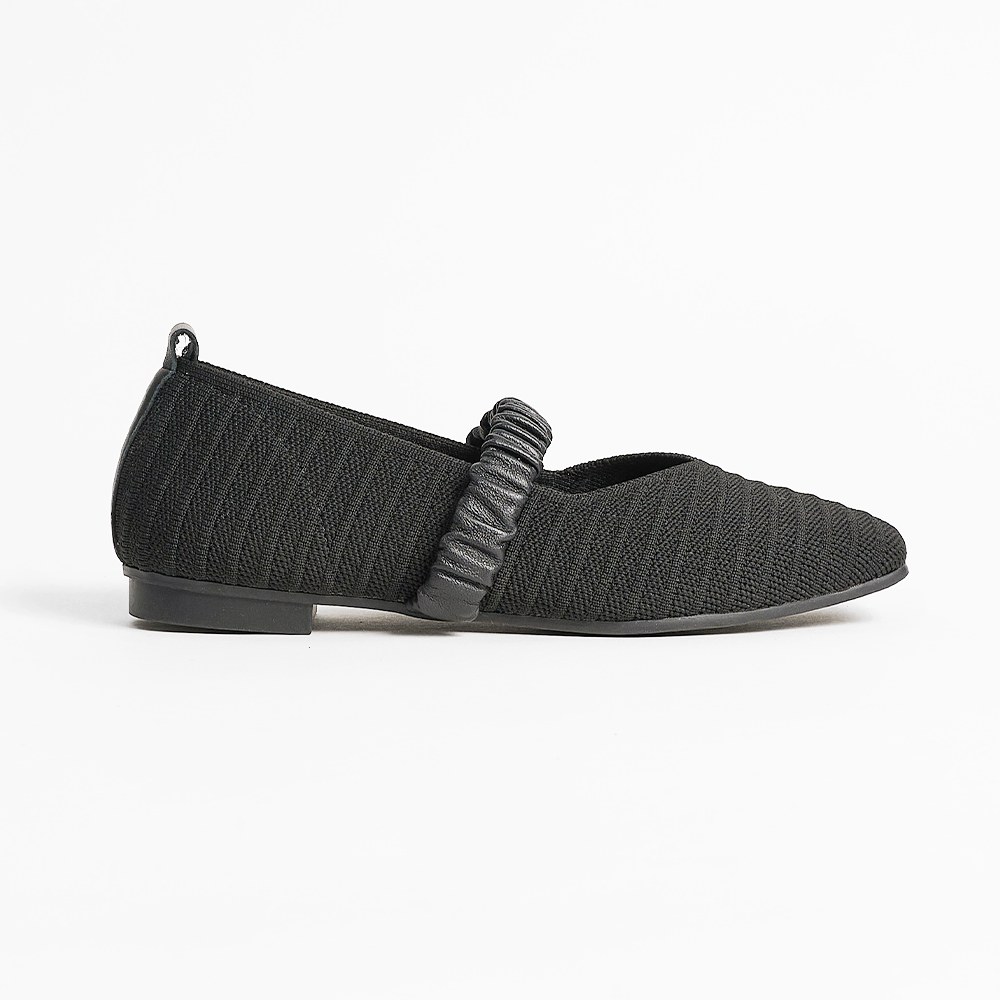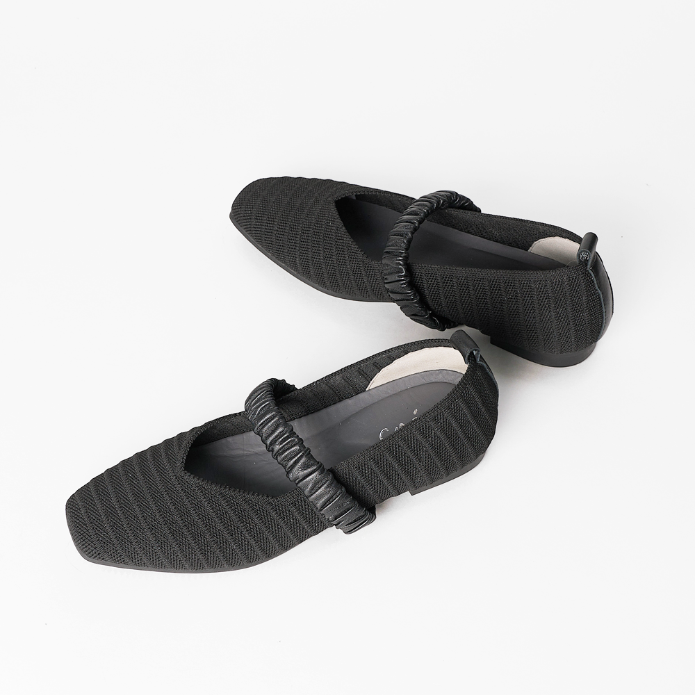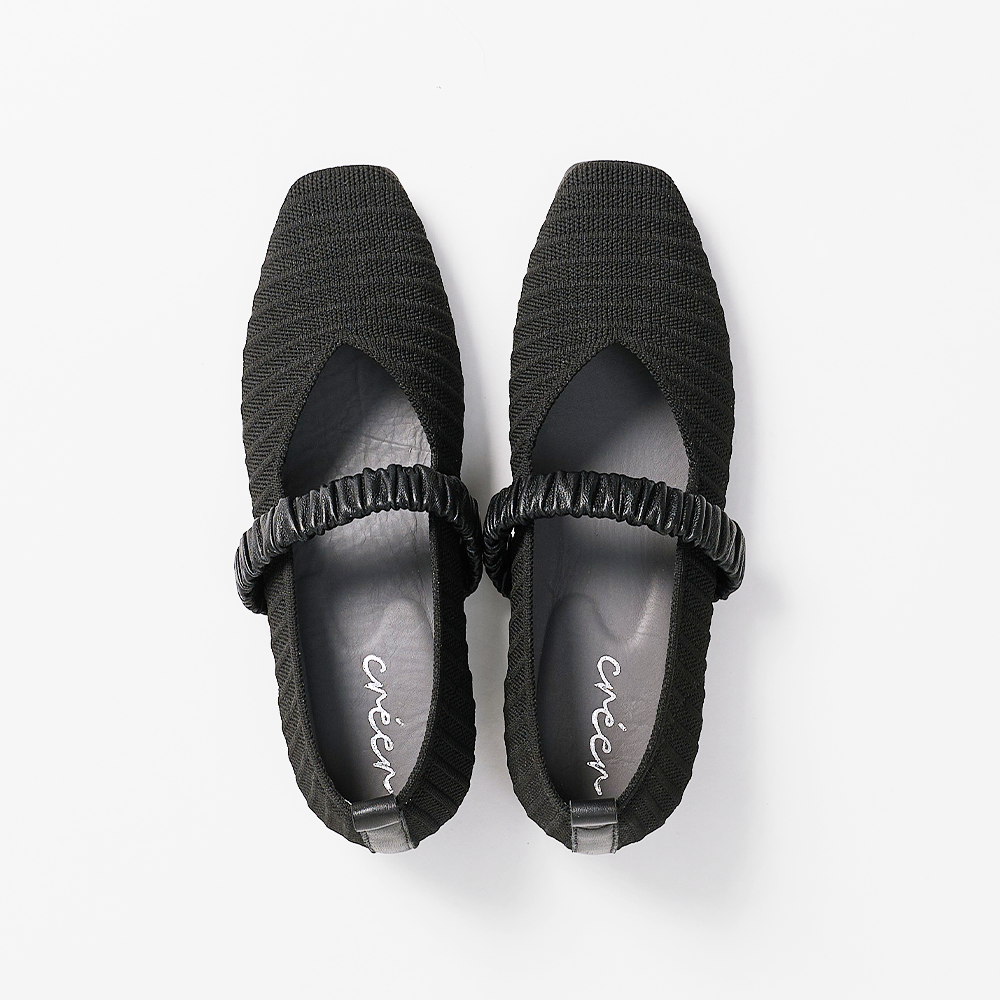 The sweater-like knit surface contrasts with a ruched leather Mary-Jane band — a subtle play of textures united in one tone. Dusky and understated, with leather detailing that quietly elevates the look.