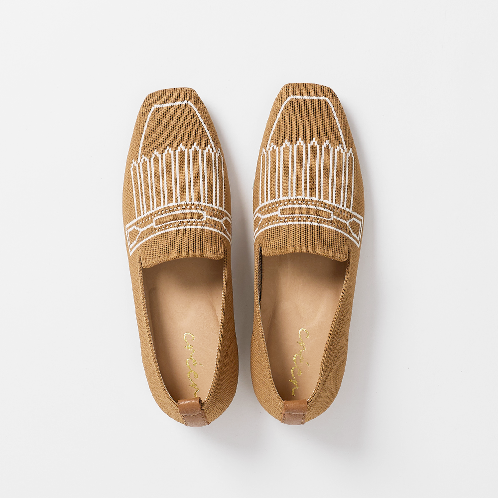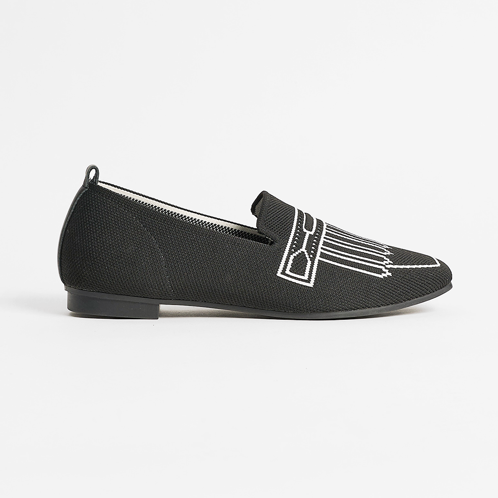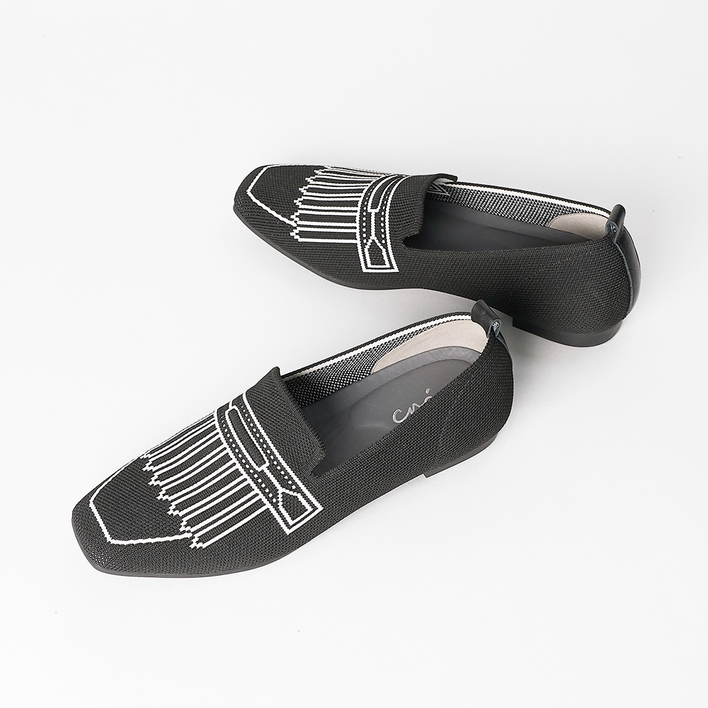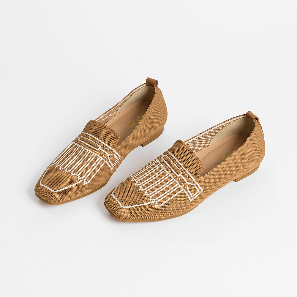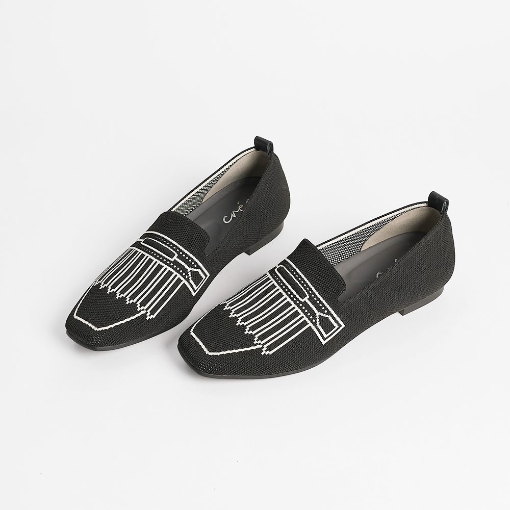A square-toe loafer with a knitted upper and playful pixelated fringe illusion—where structure meets subtle charm.